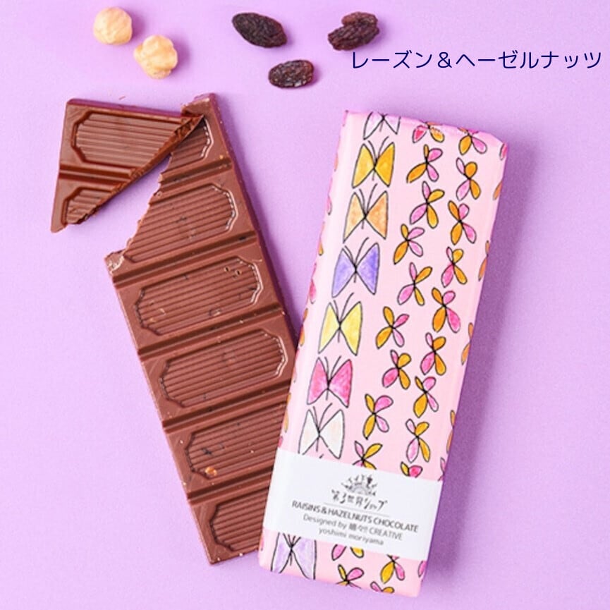 ヘーゼルナッツパウダーを練りこんだリッチで口溶けのよいミルクチョコレートに、レーズンとヘーゼルナッツが入っています。レーズンの甘酸っぱさとヘーゼルナッツの香ばしい風味が、ミルクチョコレートの濃厚な甘味を引き立ます。ココアバターを贅沢に使うことで、口に入れた瞬間なめらかに溶け、香りや甘さが一気に広がり、チョコレートの風味を一層感じられます。