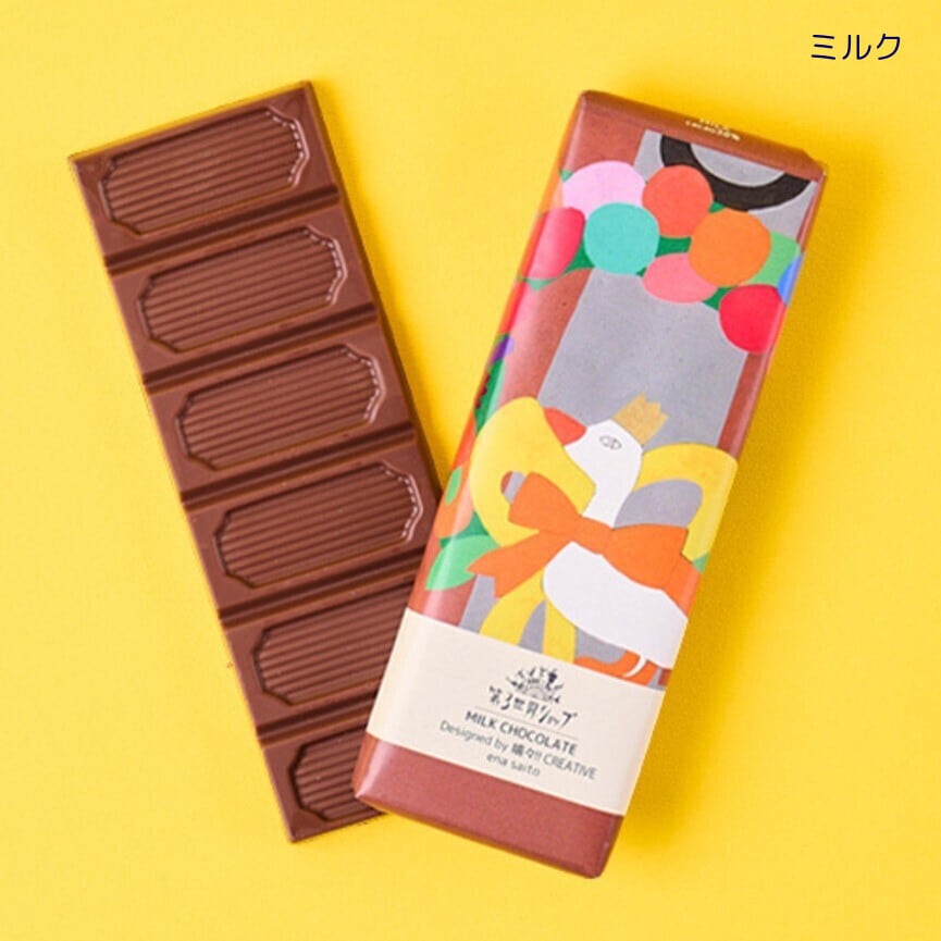 オレンジビターチョコレートは、山本 頼子さんの「Wishing you a lovely day」のアートワークがデザインされたパッケージ。