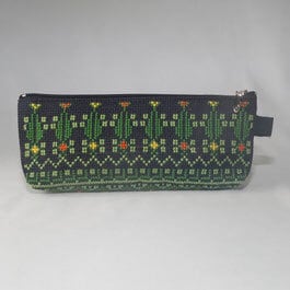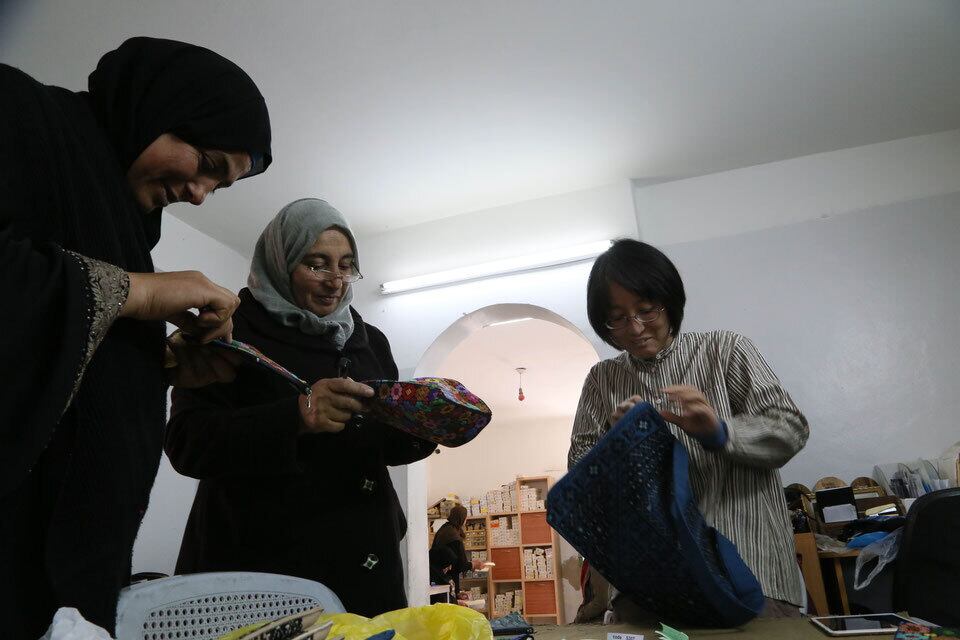 ヨルダン川西岸地区(パレスチナ自治区)のイドナ村女性協働組合。約50人の女性たちがひと針ひと針大事に手刺繍しています。中心スタッフの女性たちがデザインから議論して試作を重ねて製品を開発。メンバーはデザインや材料を事務所に取りに来て、刺繍は各家庭で空いた時間に行なっています。ミシンでの縫製も仕上げのアイロンも、最後までメンバーが行っています。