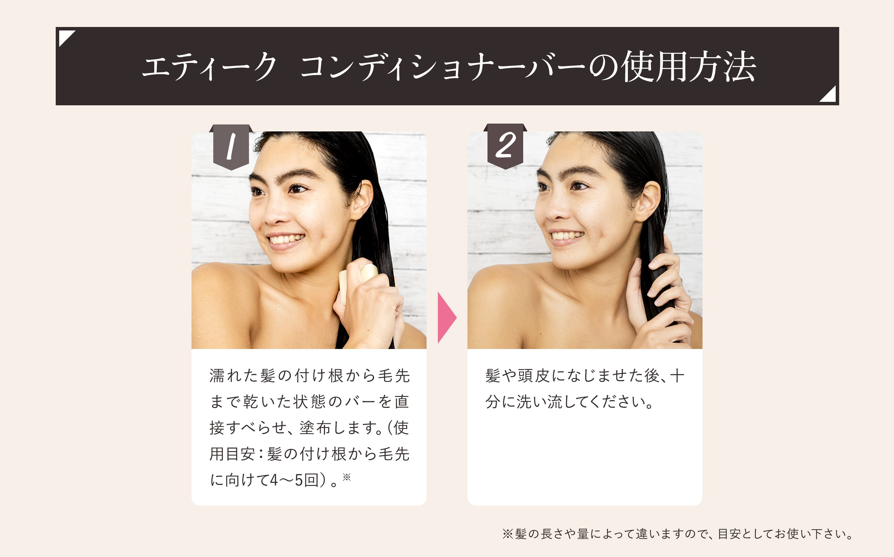 シャンプー後、濡れたコンディショナーバーを濡れた髪の上に4〜5回滑らせます。髪を撫でる様に塗布します。髪と頭皮になじませた後に十分にすすいでください。