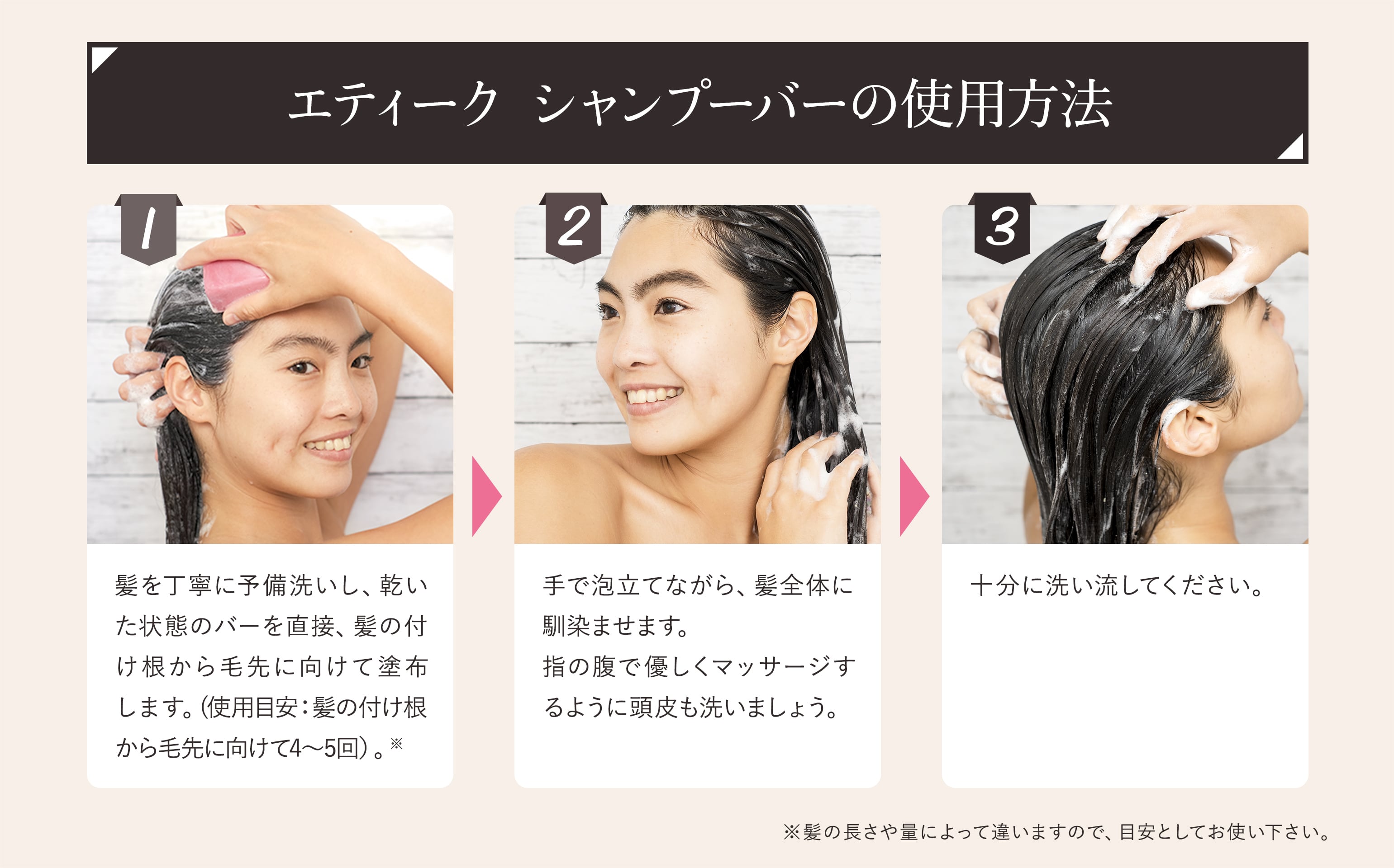 濡れたシャンプーバーを濡れた髪のつけ根から毛先に向け数回塗布します。頭皮部分から指先で泡立て、頭皮と髪の毛を洗います。その後十分にすすいでください。